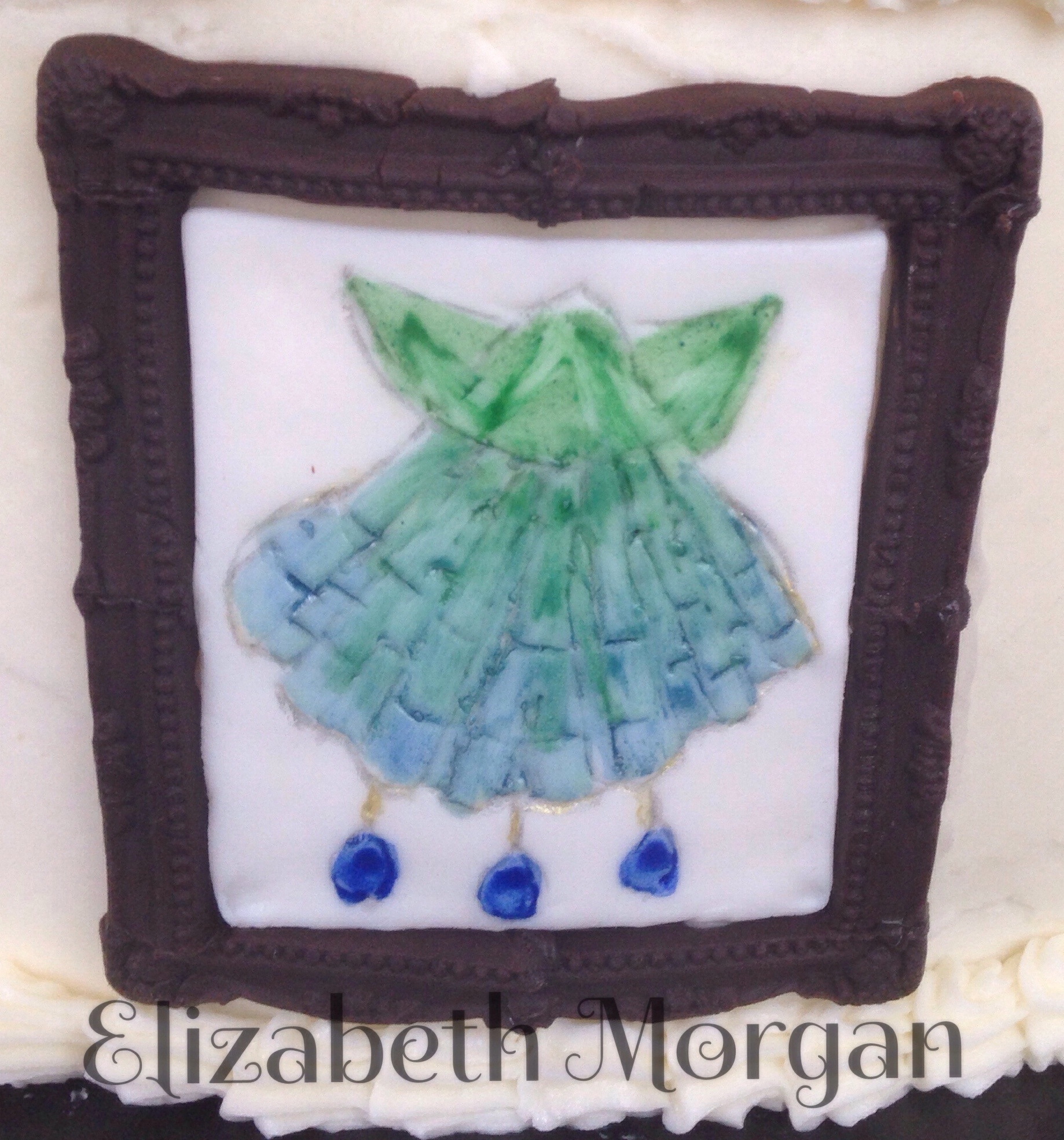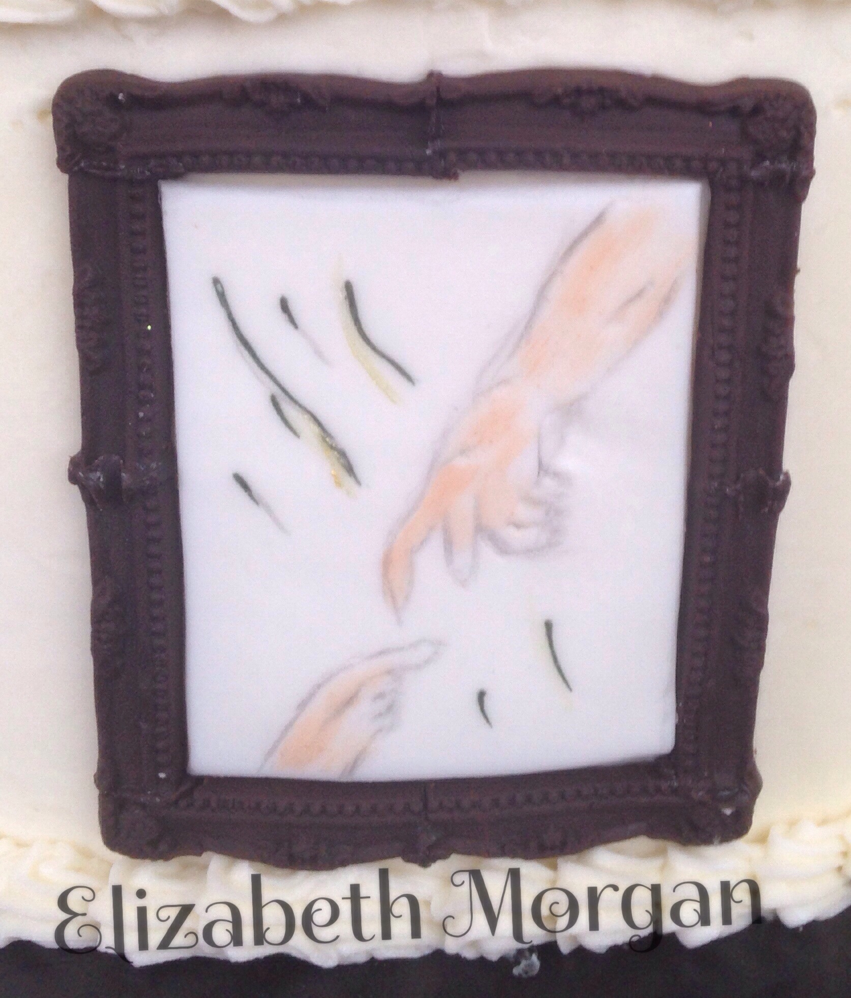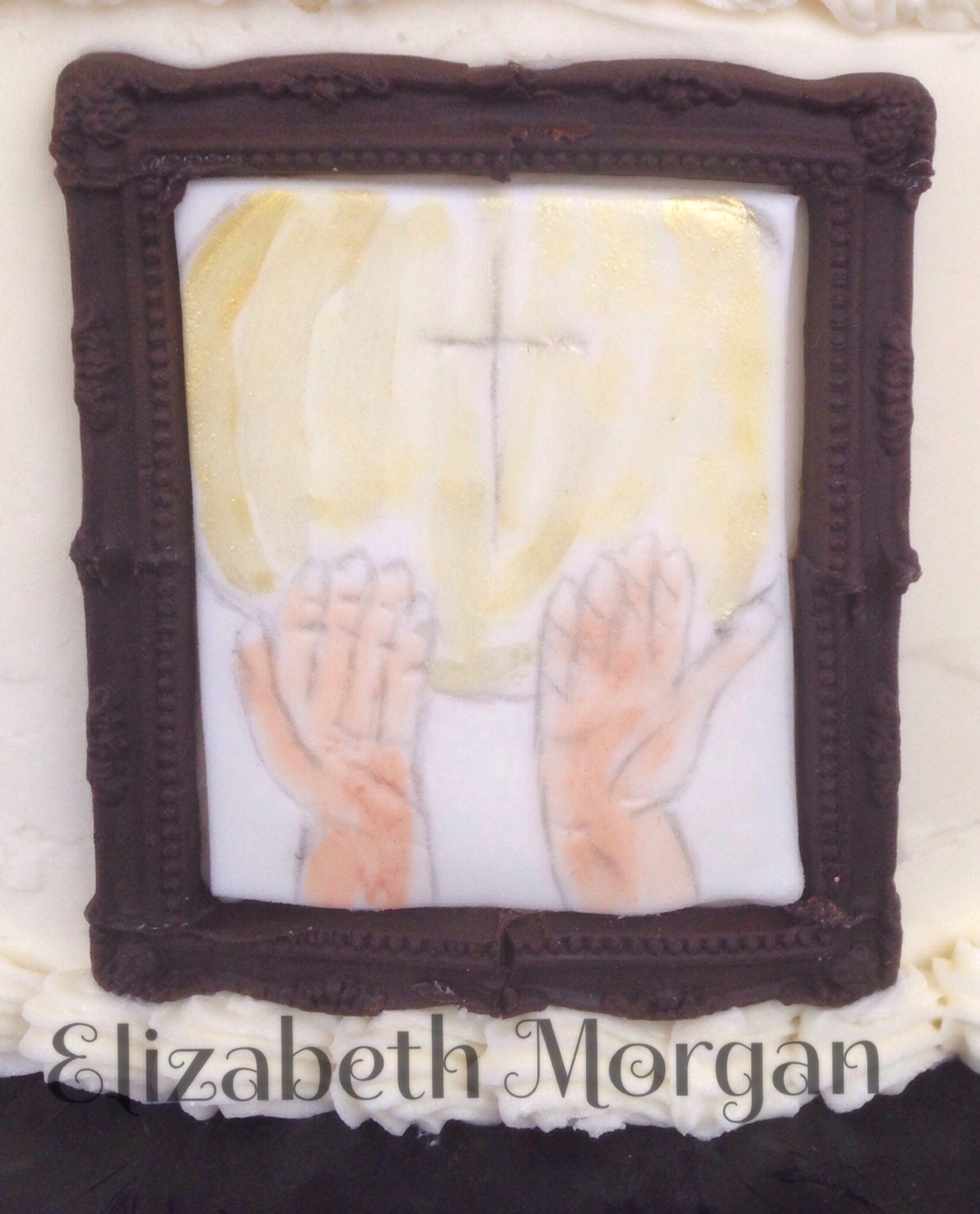 Confirmation cake. The Holy Spirit shining down on the names of the newly confirmed. Hand painted symbols of the Holy Spirit are in picture frames made from modeling chocolate. Fire, the seal, anointing, hands, clouds and light, God's finger, and water.