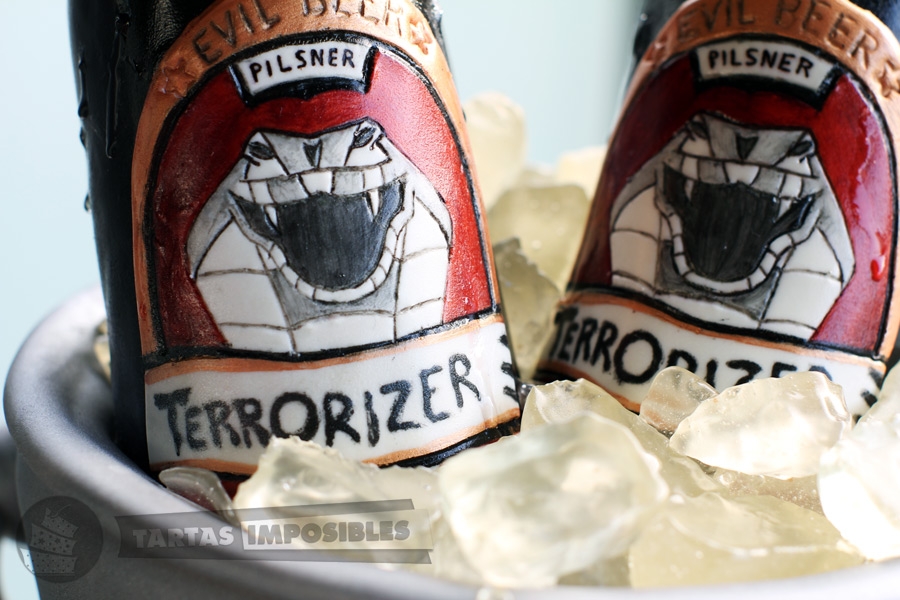 I made this cake for a writer’s new book called Terrorizer. He likes beer a lot so I supposed that was a good idea to promote his new proyect. Orange and chocolate brownie with cheesecream. Ice cubes made with isomalt and hand painted beers in RKT. Thanks for sharing!