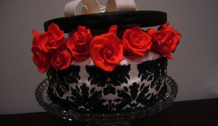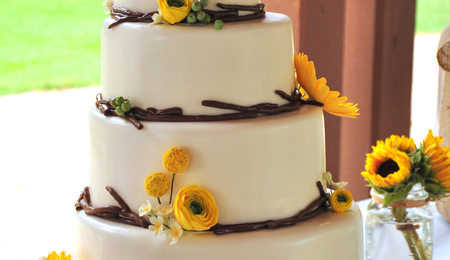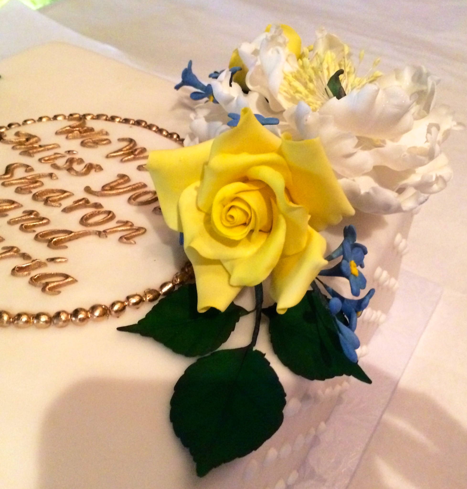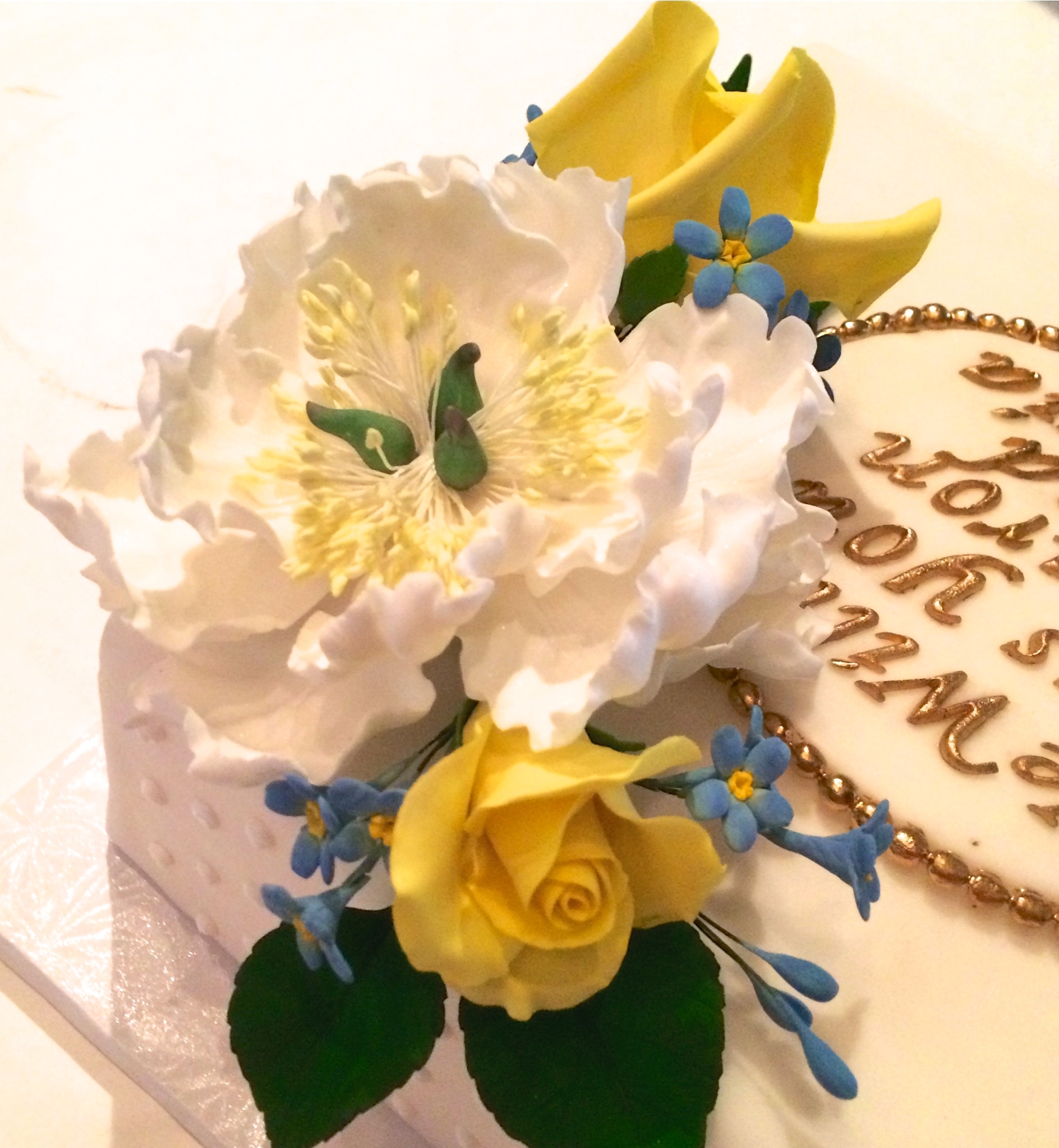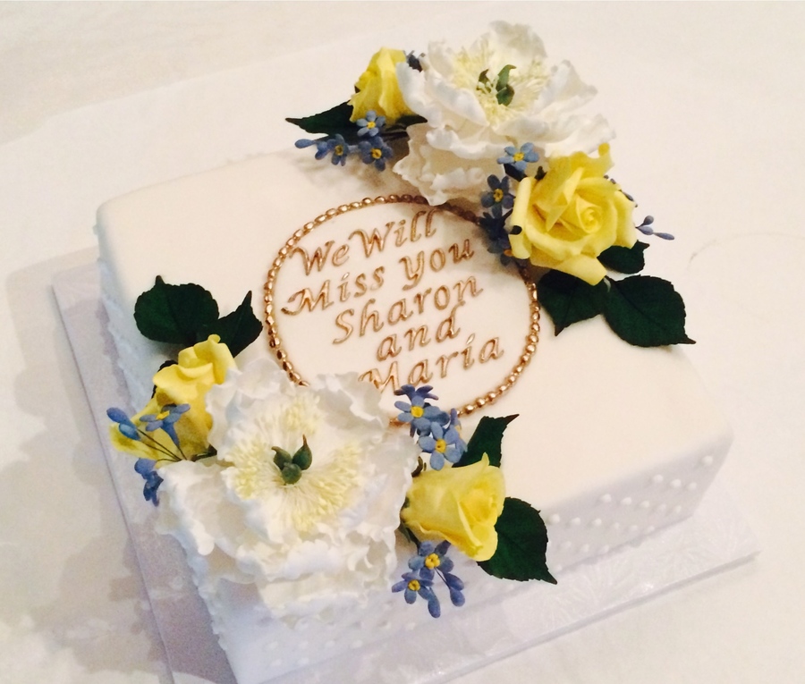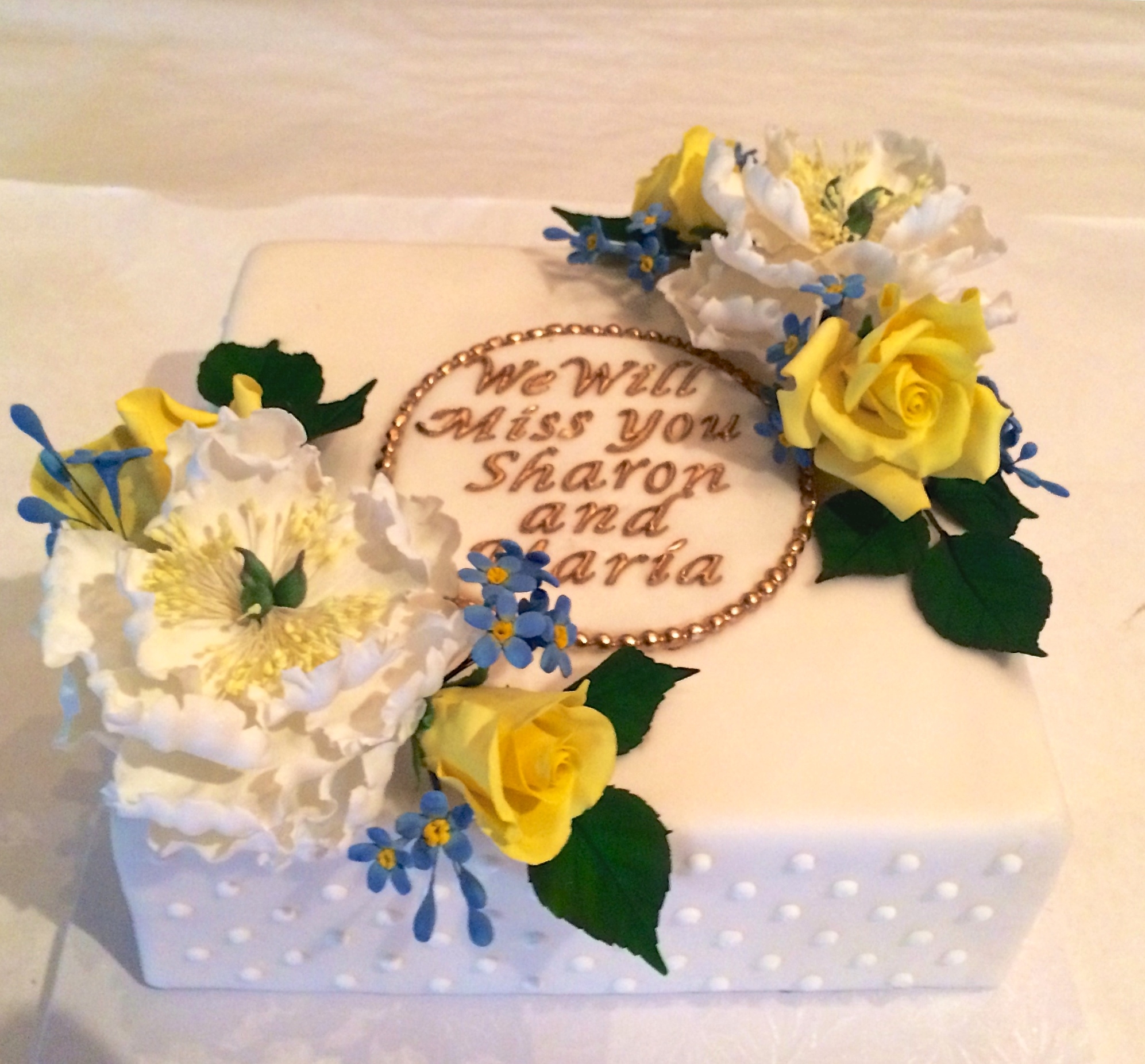 Simple, floral cake for two co-workers who are retiring. Fondant covered cake with piped royal icing dot design on the side. Plaque made using fmm letter cutters and then hand painted gold. Handmade sugar flower bouquets made as a keepsake for the ladies consisting of white peonies, yellow roses, and forget-me-nots.