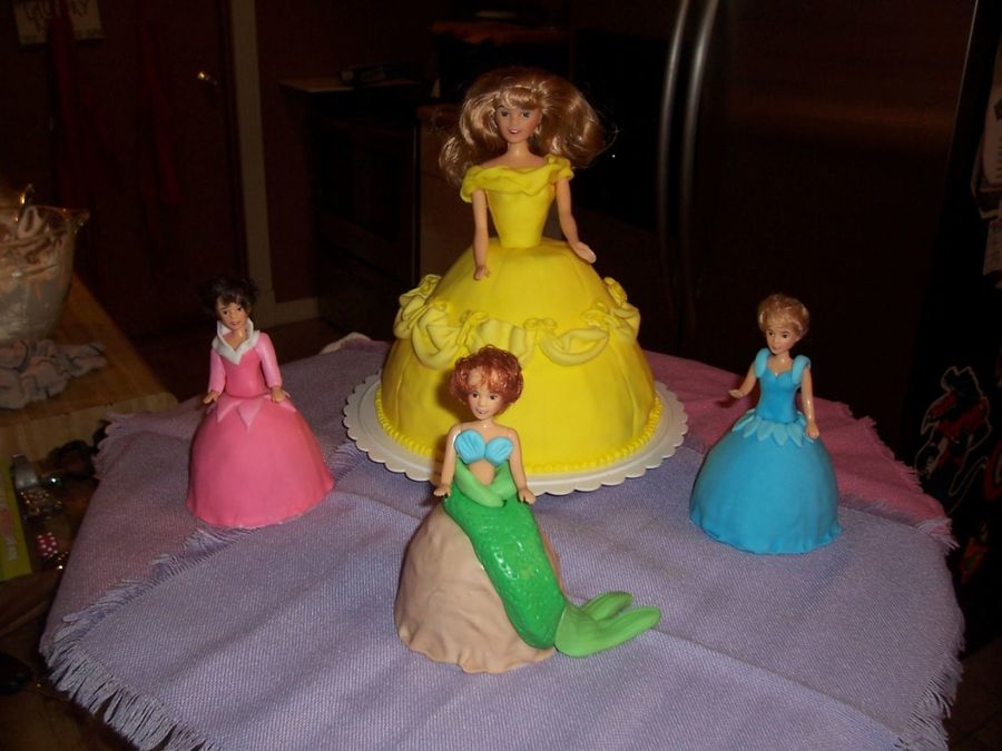 My daughter wanted Disney Princess Doll cakes for her birthday. I used the mini doll picks I had in my cake decorating stuff and the mini doll pan by Wilton's to make the small cakes and Belle is the largest because she is "The Best"