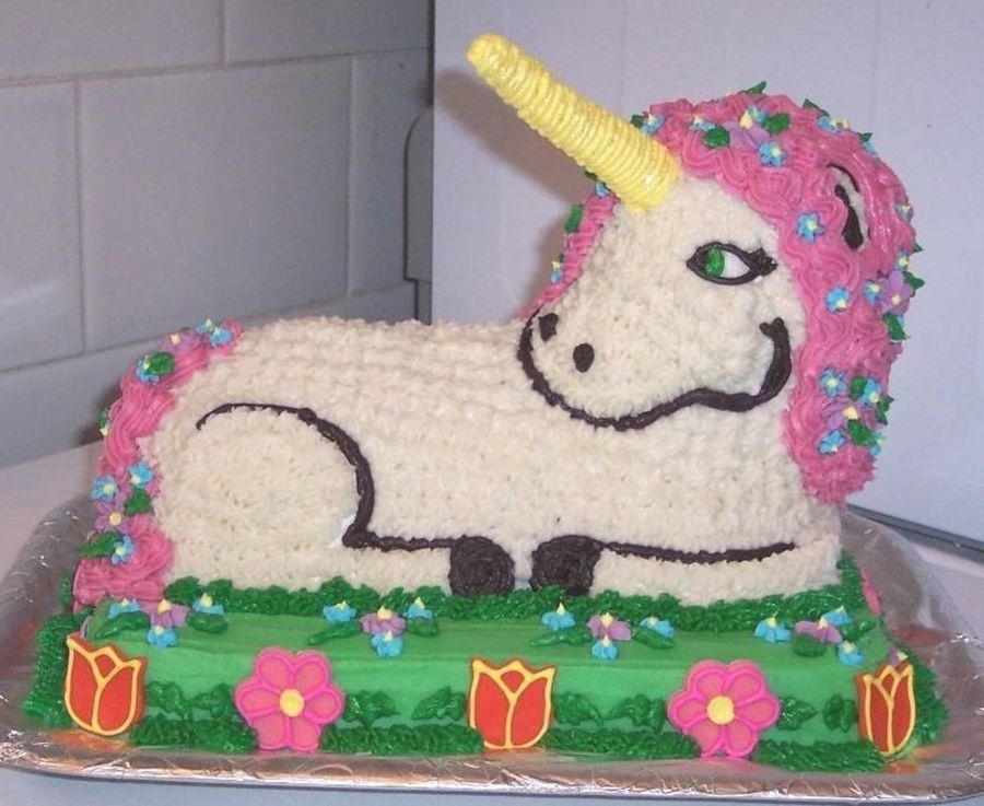 Unicorn is a lemon buttermilk pound cake made in the 3D lamb pan. Base is 11 x 7" rectangle chocolate chocolate chunk pound cake. Both cakes iced in buttercream, horn (sprinkled with disco glitter and luster dust for a magical look!), and drop flowers made from royal icing and flowers around base made from MMF with royal icing details.