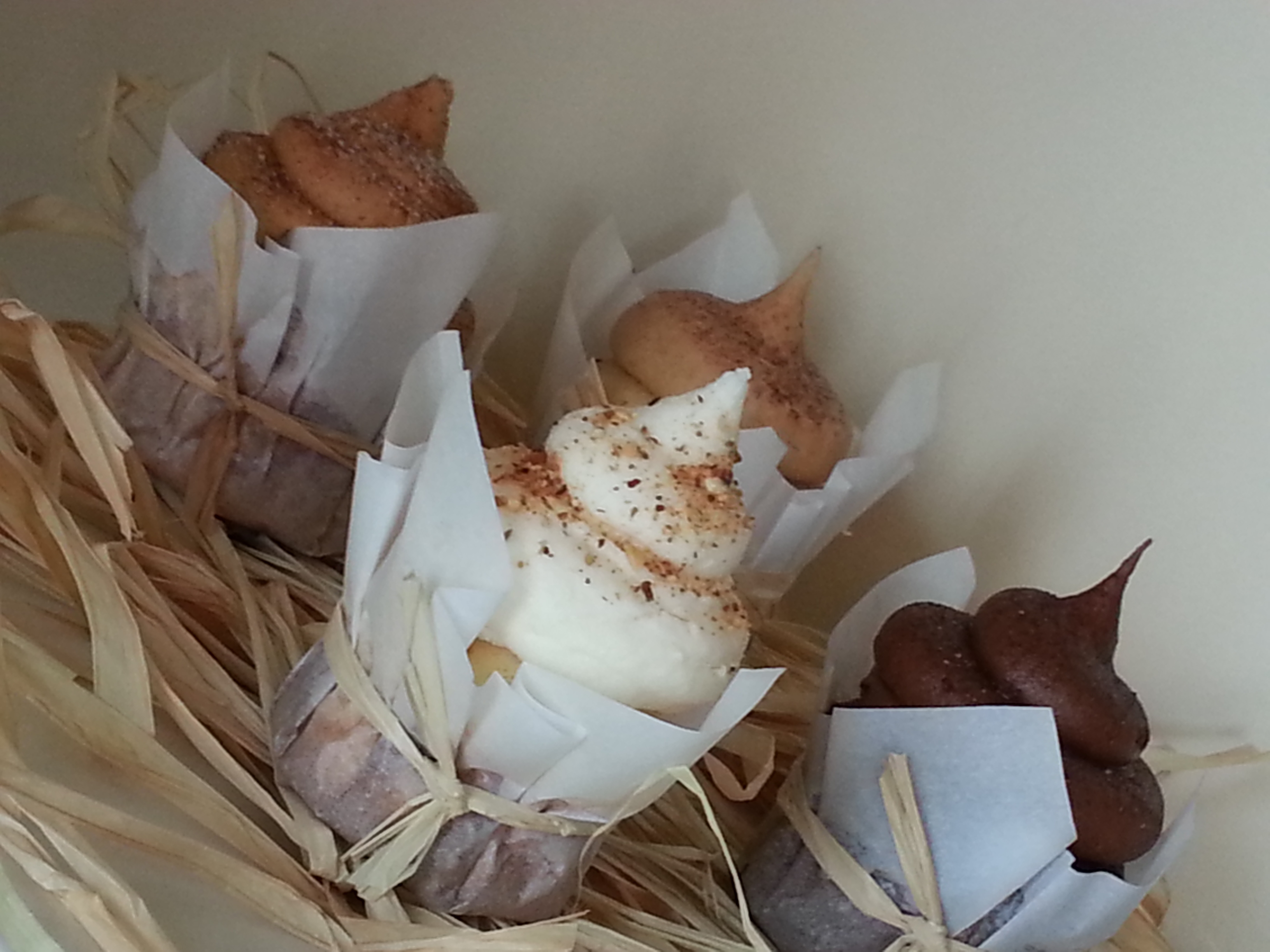 Country style cupcake tower. Flavors Cinnamon sugar, Chocolate raspberry, Peanut butter cup and Almond hazelnut.