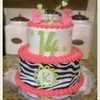 2 tier 9 and 7 inch. Fondant decorations with Disco dust. Zebra print is an edible image printed from idesign at Icing Images.