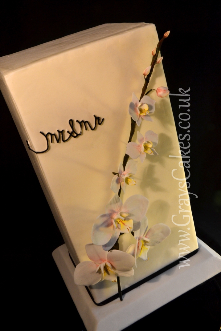A lovely triple barrel square: this was covered using fondant/modelling chocolate mix panels with gumpaste orchids. hope you like it!