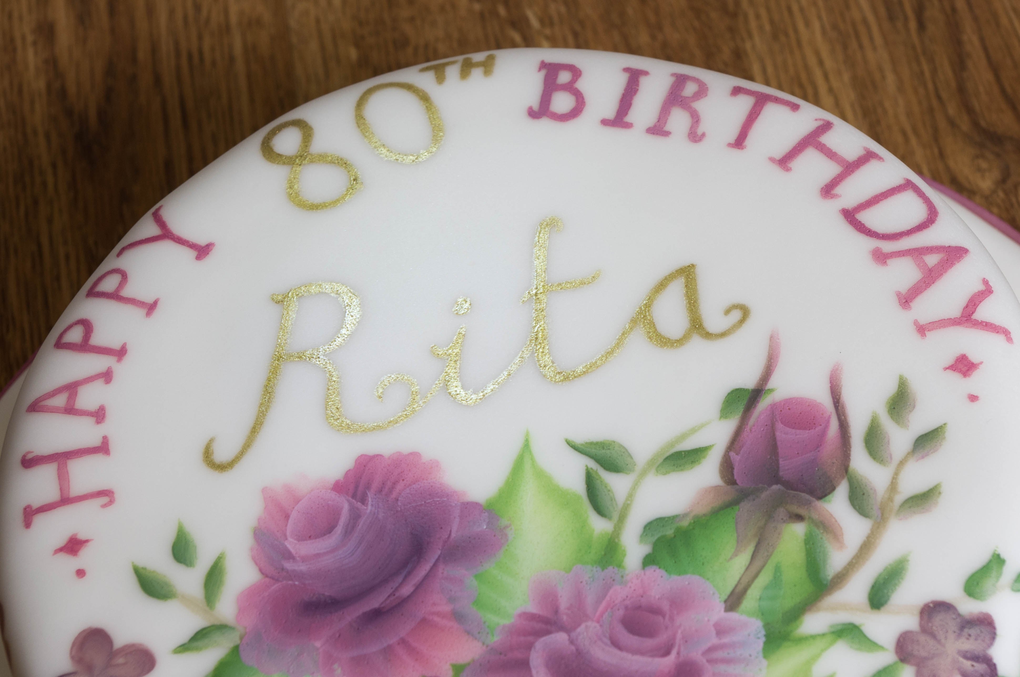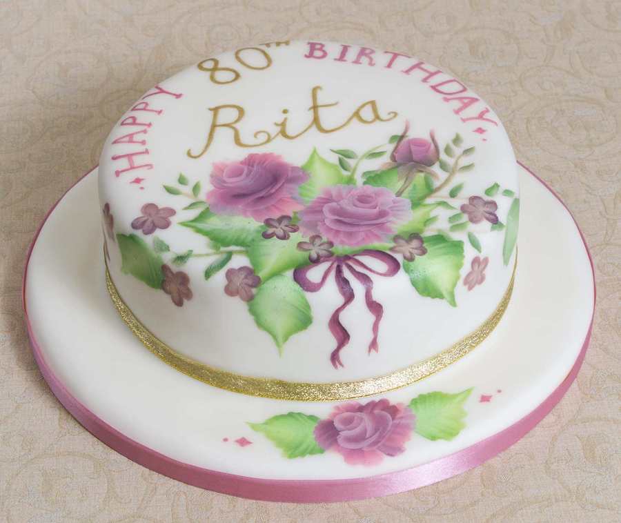 80th Birthday cake handpainted with roses and flowers