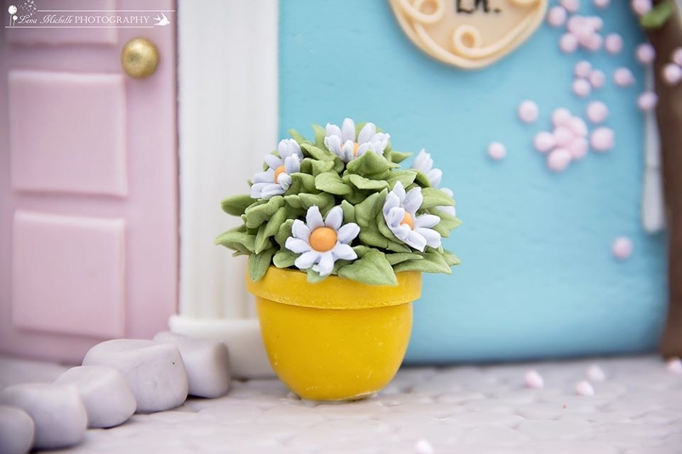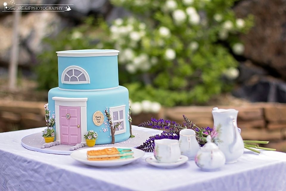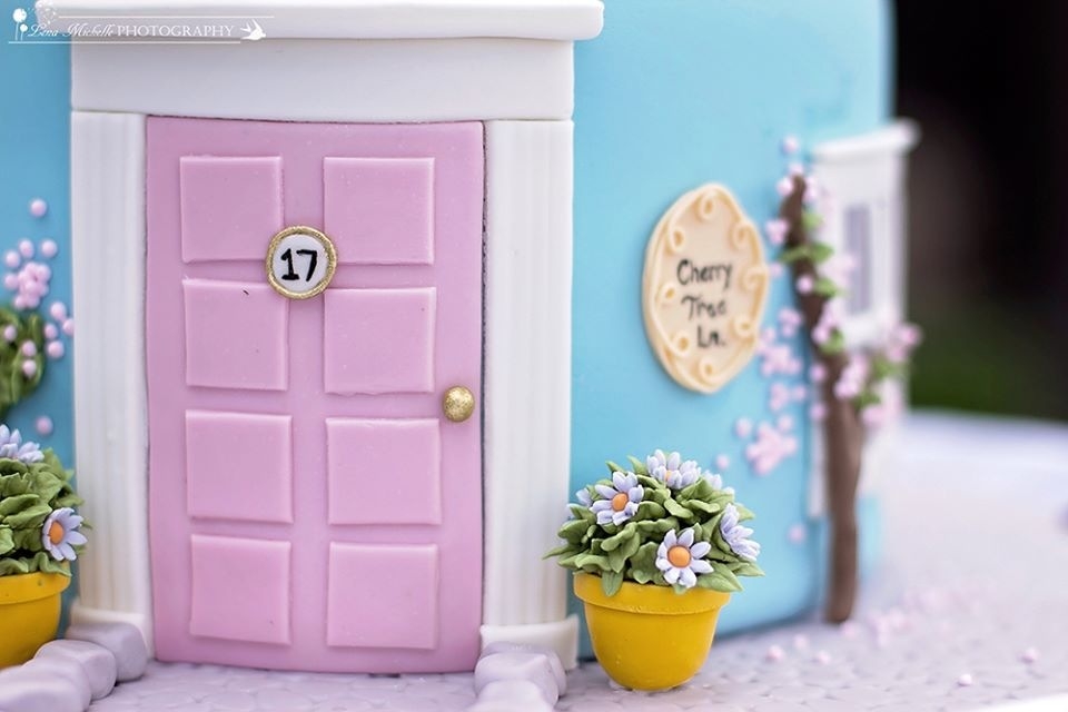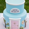 Mary Poppins themed cake: 17 Cherry Tree Lane, whimsical version. Customer added a black silhouette topper of Mary Poppins.