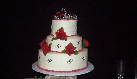 My husband and I renewed our vows at our church for our 20th Anniversary. I wanted to do our cake since I had just finished taking 2 Wilton Classes. I used a 10 in and 12 in heart shaped cake pans and intertwined them and covered them in all buttercream icing. I used royal icing to make the roses and the white lilies.