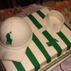 A birthday cake for a very nice client who brought me a picture from the Internet. I could not verify the source, and feel bad since I want to give credit "to whom credit is deserved". This is a rectangular 11x15 vanilla cake, all white American buttercream, with green stripes made out of fondant, and so is the baseball cap. Both "Polo" logos are also in fondant. Green fondant is Wilton's.