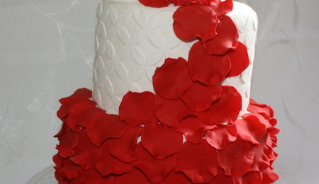 Red Gumpaste Rose And Rose Petals On Round Wedding Cake