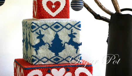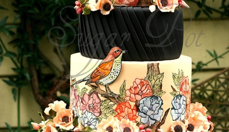 my folk art inspired cake which I created for Magazin Magie des Zuckers , August 2014 edition. The inspiration board sent out was Folk art inspired and I loved it the moment I saw it. Taking elements from the board, I added a few of my own....like all of my cakes, I wanted this cake to tell a story as well. I pictured a gypsy caravan, studded with bright and vibrant coloured rugs , shawls , scarfs some with hand embroidered cross stitch patterns and beaded necklaces- hence the bright red tier. I saw old Chinaware..which you could tell had withstood the time and travels as it had the cracked pattern on it- this I incorporated on top and bottom tiers- the cracked glass effect.