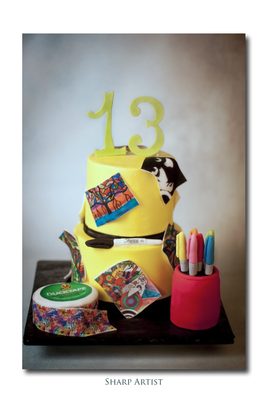 Birthday cake for a 13 year old that loves to draw with Sharpies and make things with duck tape. All buttercream with edible images. Duck tape and pencil holder made with RKTs. Made my own mold of a Sharpie pen and used 50/50 to replicate.