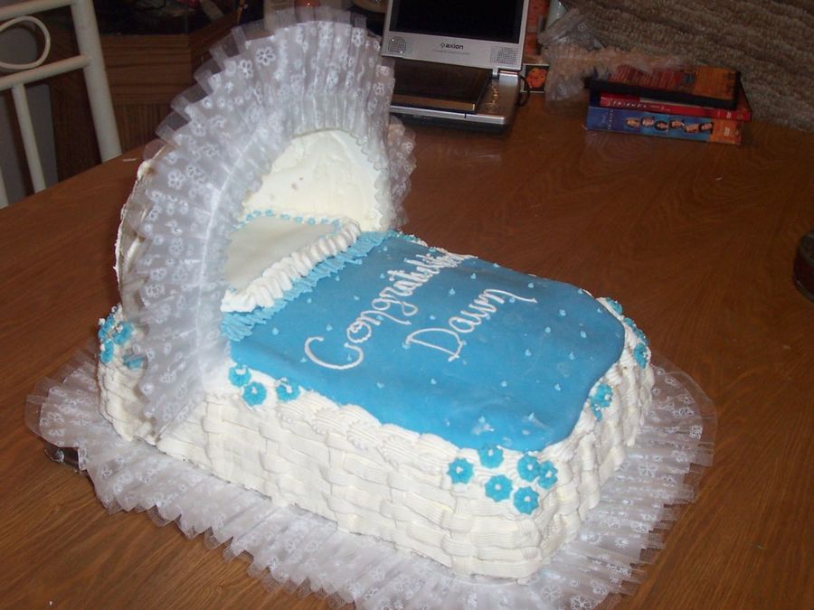 This is a bassinett cake I made for my sister's baby shower. Basket weave is buttercream icing, blanket and pillow are fondant and the flowers and hood are royal icing. The only thing not edible is the lace around the hood and bottom. It was really fun to make!