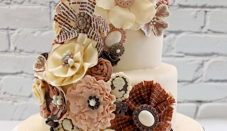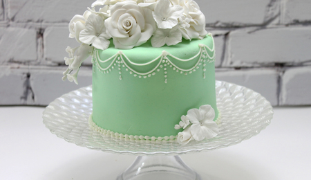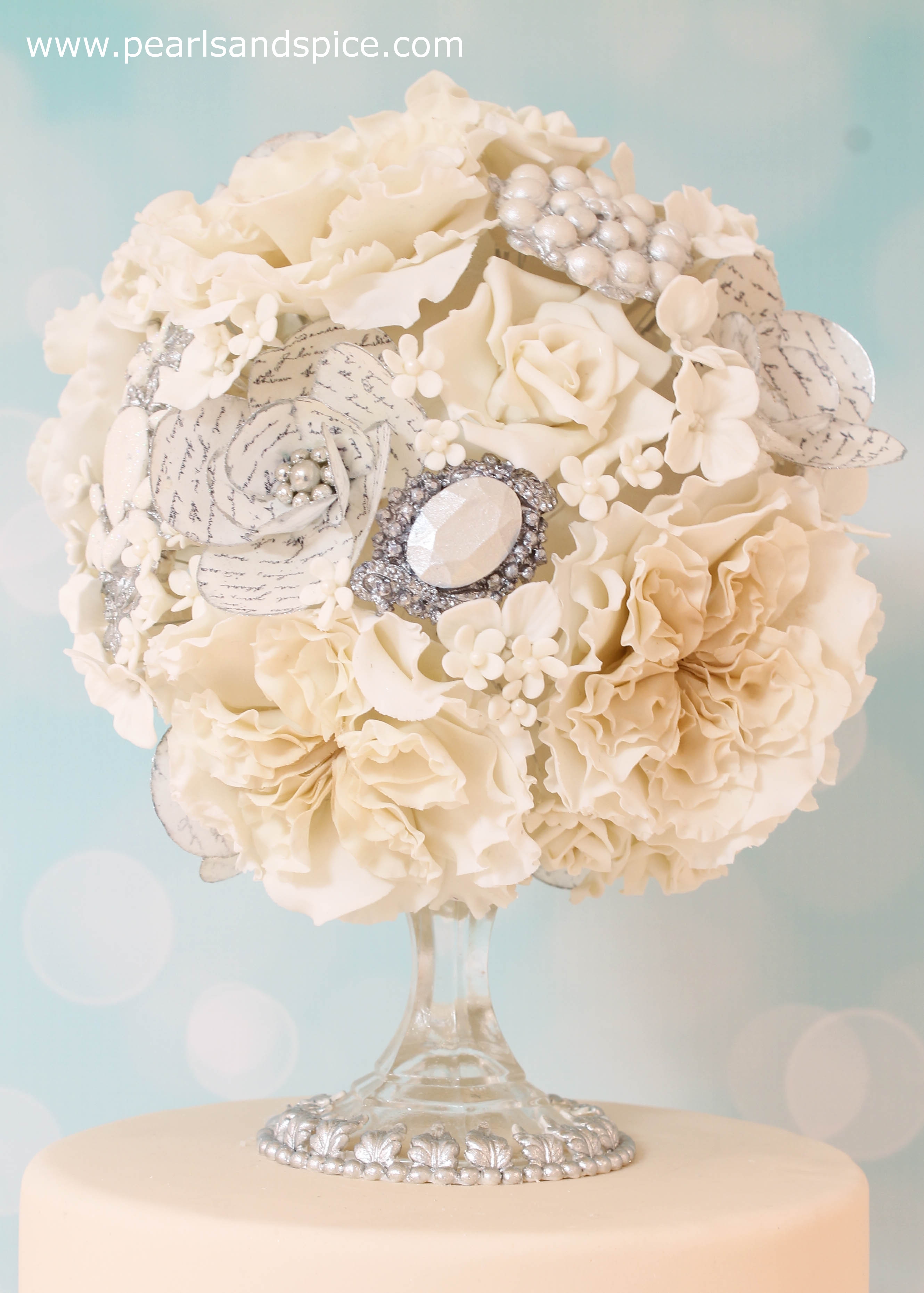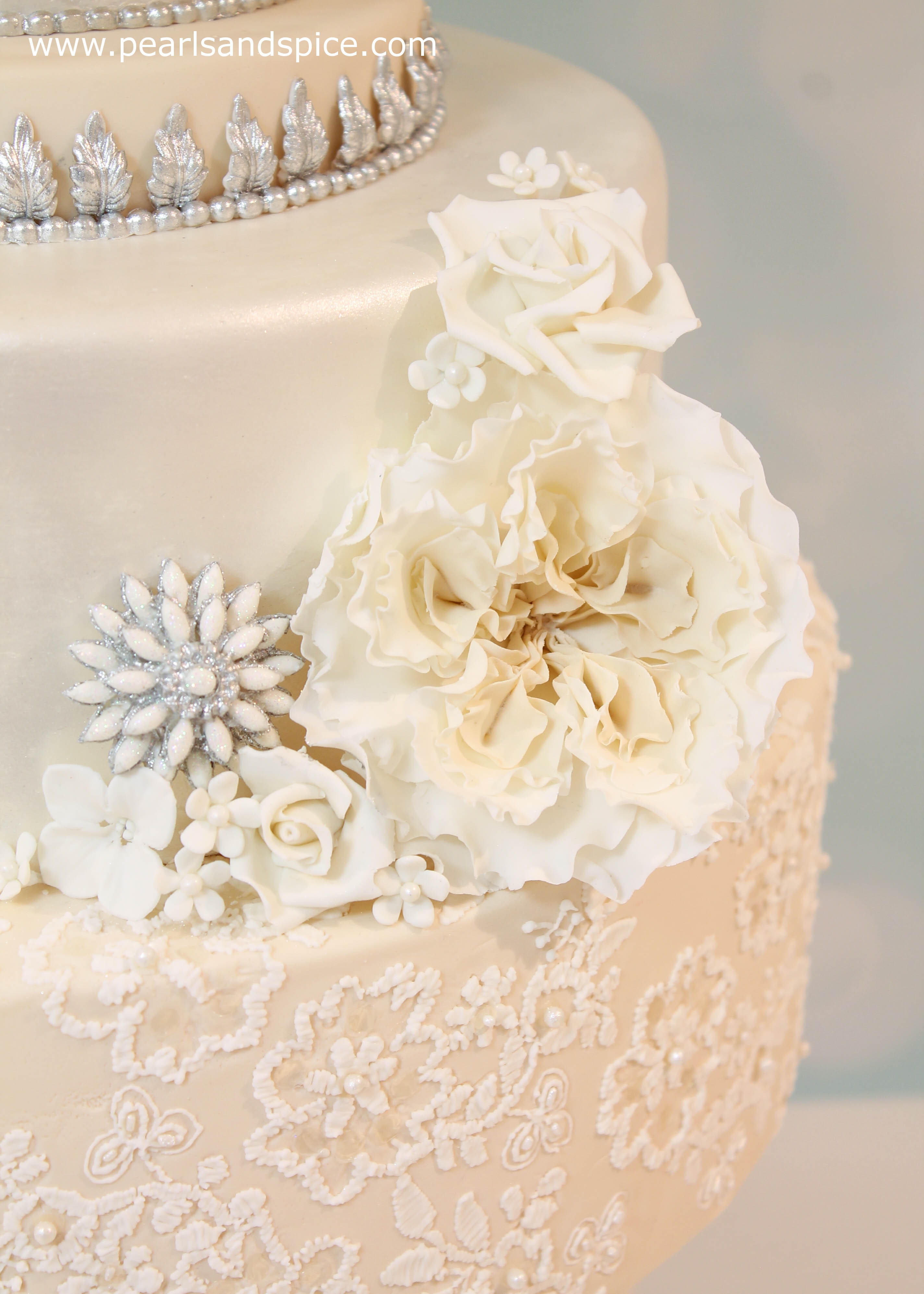 All lace is hand piped and accented with gelatin sequins and pearls. All sugar flowers are handmade.