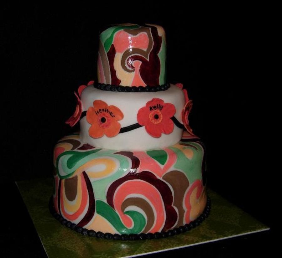 This is my version of flourgrl's Pucci cake. The customer sent me a photo of the cake and wanted a very similar replica, so thanks to flourgrl for her design and inspiration! Fondant covered cake, all freehanded and hand painted. The photo is dark because it was 3am, and I realized afterwards that I hadn't put the middle border on yet! Oops!