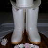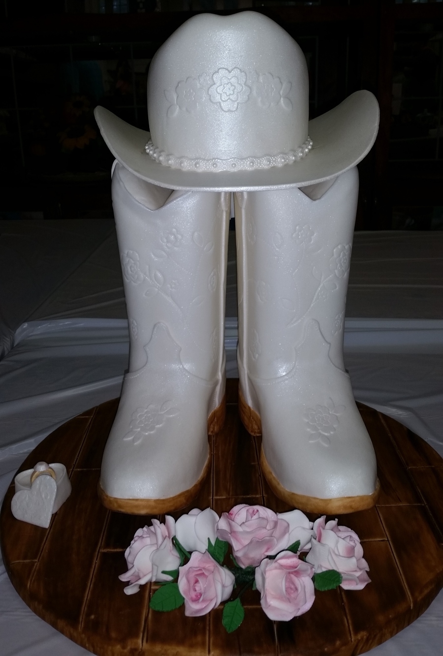 This is my entry into the 2014 NC State Fair. The boots and hat are Styrofoam covered in fondant and airbrushed with pearl dust.The brim is all gum paste. Roses are gum paste dusted with petal dust. Ring and box are 50/50 veil is all gumpaste.Since i posted this picture I went to the fair to see how my cake did. I was very pleased to see that it took first in its class, however i was heartbroken when i saw the back of the brim had fallen down. I have no clue as to why it did. I assume it was not damaged before the judging was done. So i guess the heat in the glass cabinets just got to it. It stayed perfect at home so i'm not sure what happened. All I can say is it's another lesson learned
