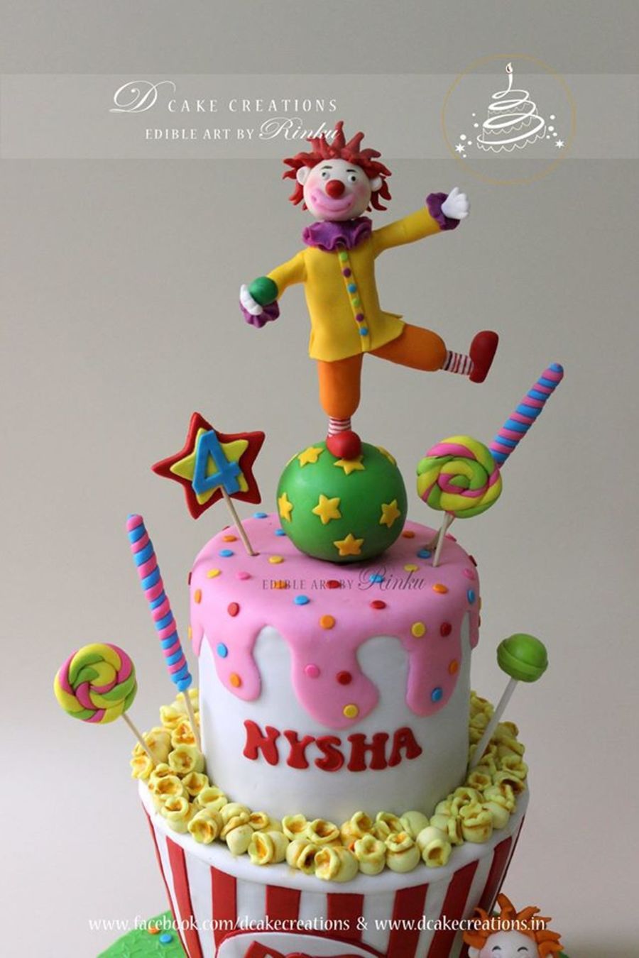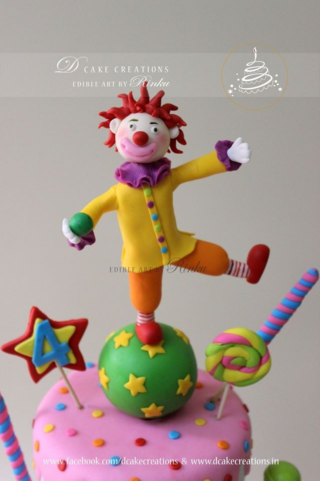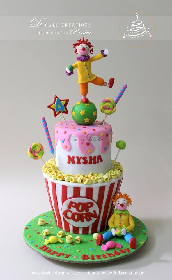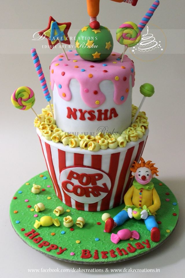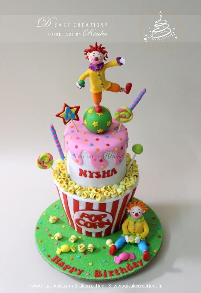 The bottom tier of the cake was designed like a popcorn container and the top tier like ice-cream. The cake was decorated with sweet goodies. A sweet little sugar clown, holding a candy, was placed at the bottom of the cake and on top of the cake was another handcrafted clown trying to balance on a ball.