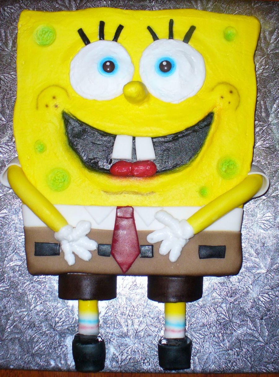 I used a 1/2 sheet yellow cake and carved the shape. The body is covered in buttercream. The pants, arms, and legs are fondant. I used an airbrush for the coloring.