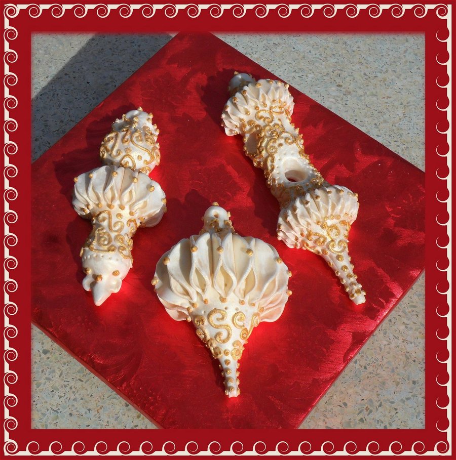 Handmade fondant ornaments. No molds. Just shaped by hand and piped royal icing that is highlighted with gold luster dust.