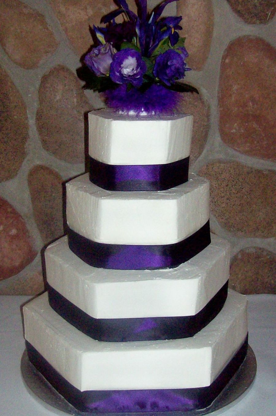 plain iced buttercream hex cakes with satin purple ribbon and fresh flower topper.