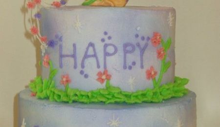 7 layer rainbow cake. All buttercream, "Bubbles" are royal icing.