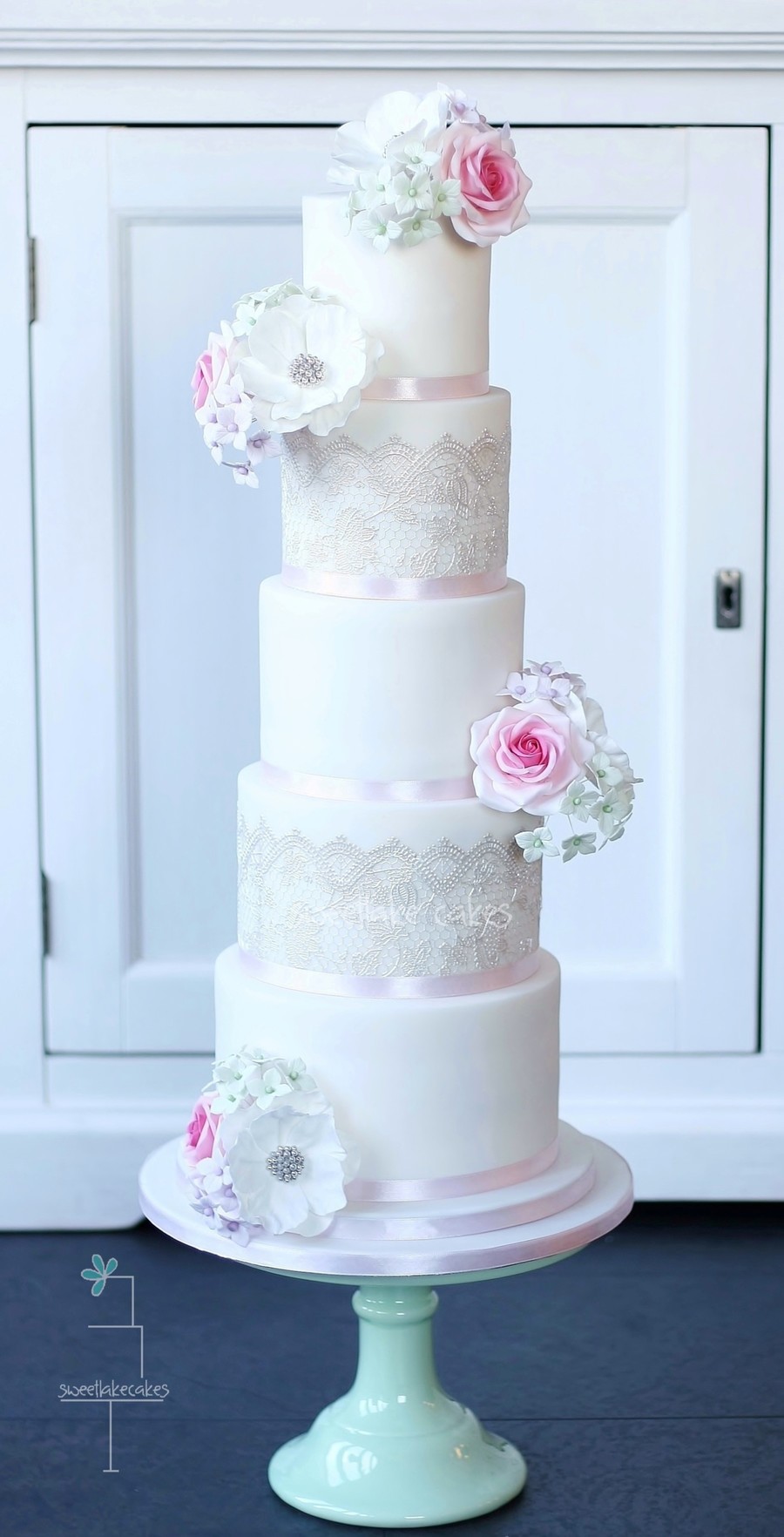 The first wedding cake of 2015. Very classic with lace and sugar flowers.