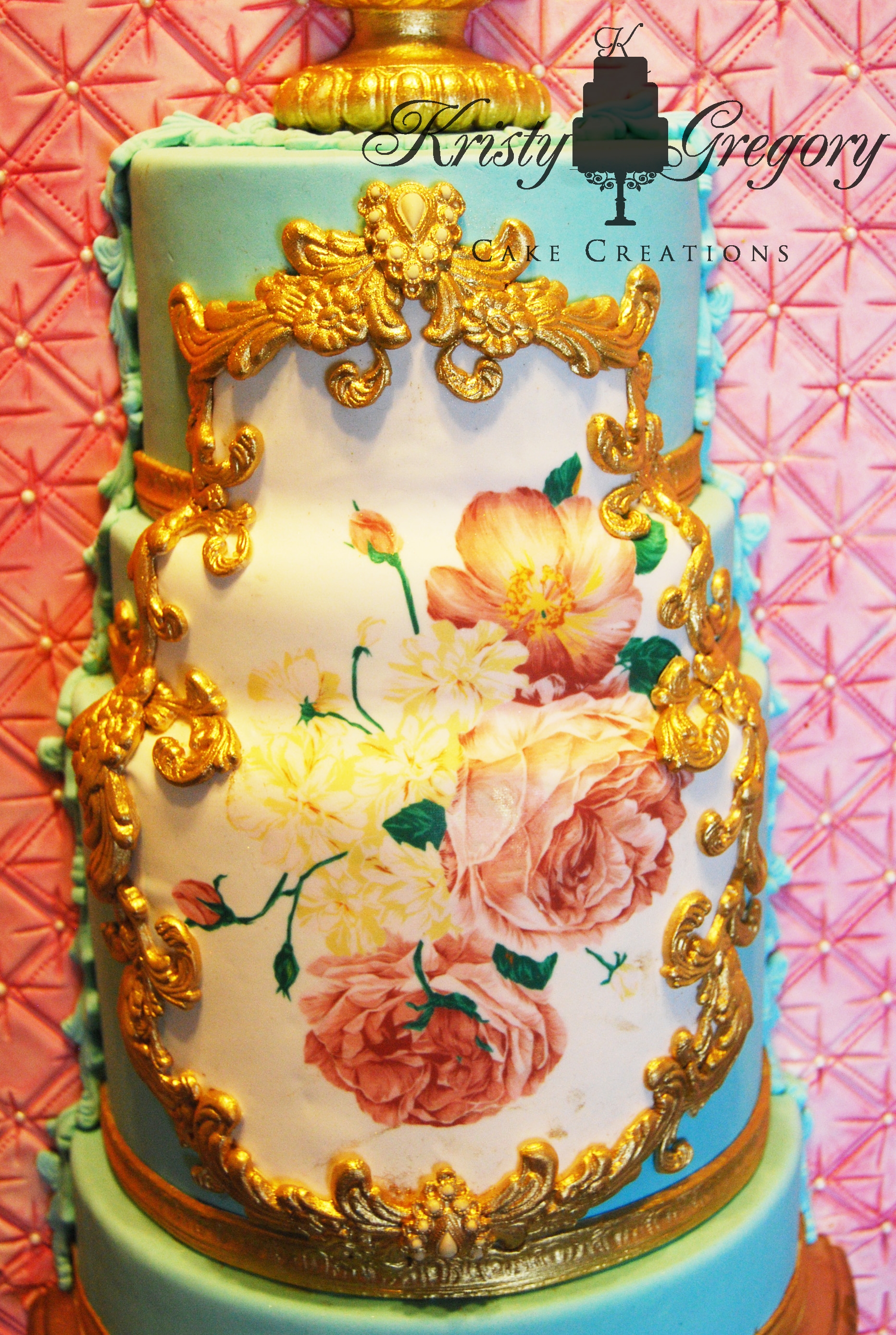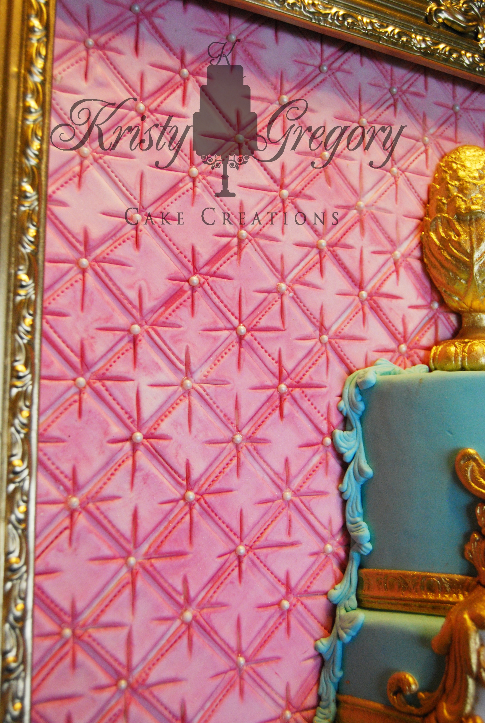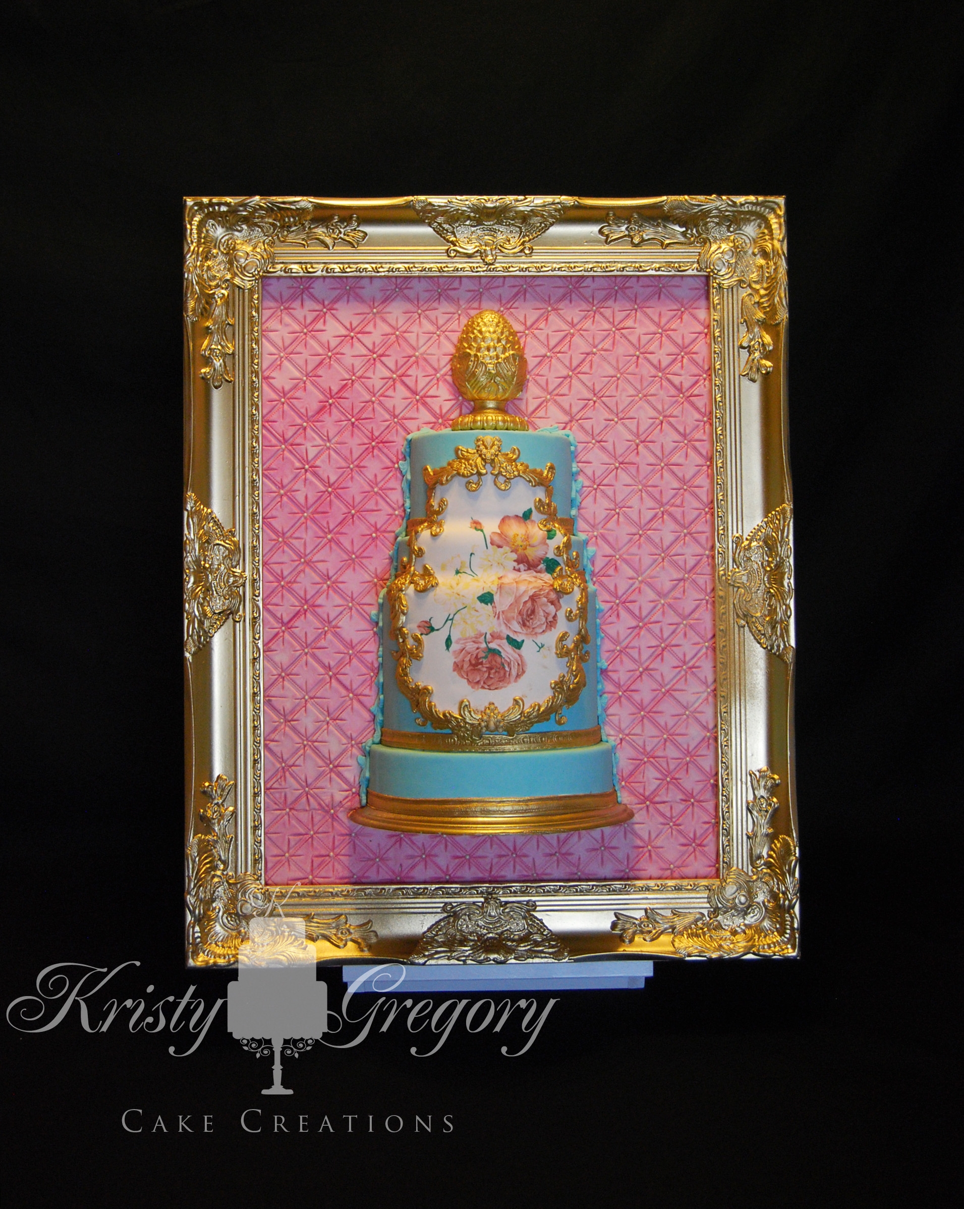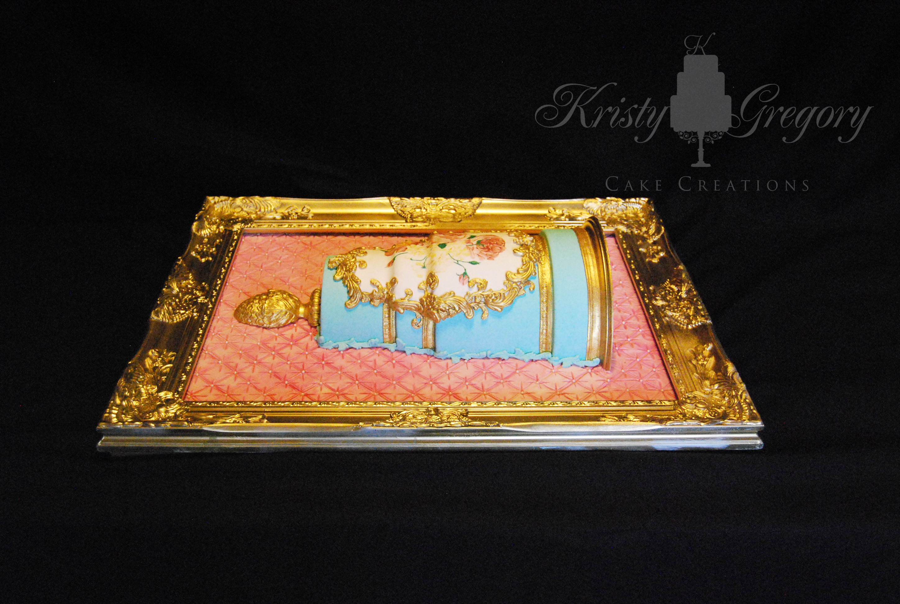 This was my entry into the Cake Fest competition recently in La. Cake is fondant covered and decorated, backboard is also covered and decorated in fondant and then washed with pink. Frame and cake board is a regular wood painted to match the Rolkem gold 100% edible dust used on the cake. More photos can be found on my Facebook page www.facebook.com/KristyGregoryCakeCreations
