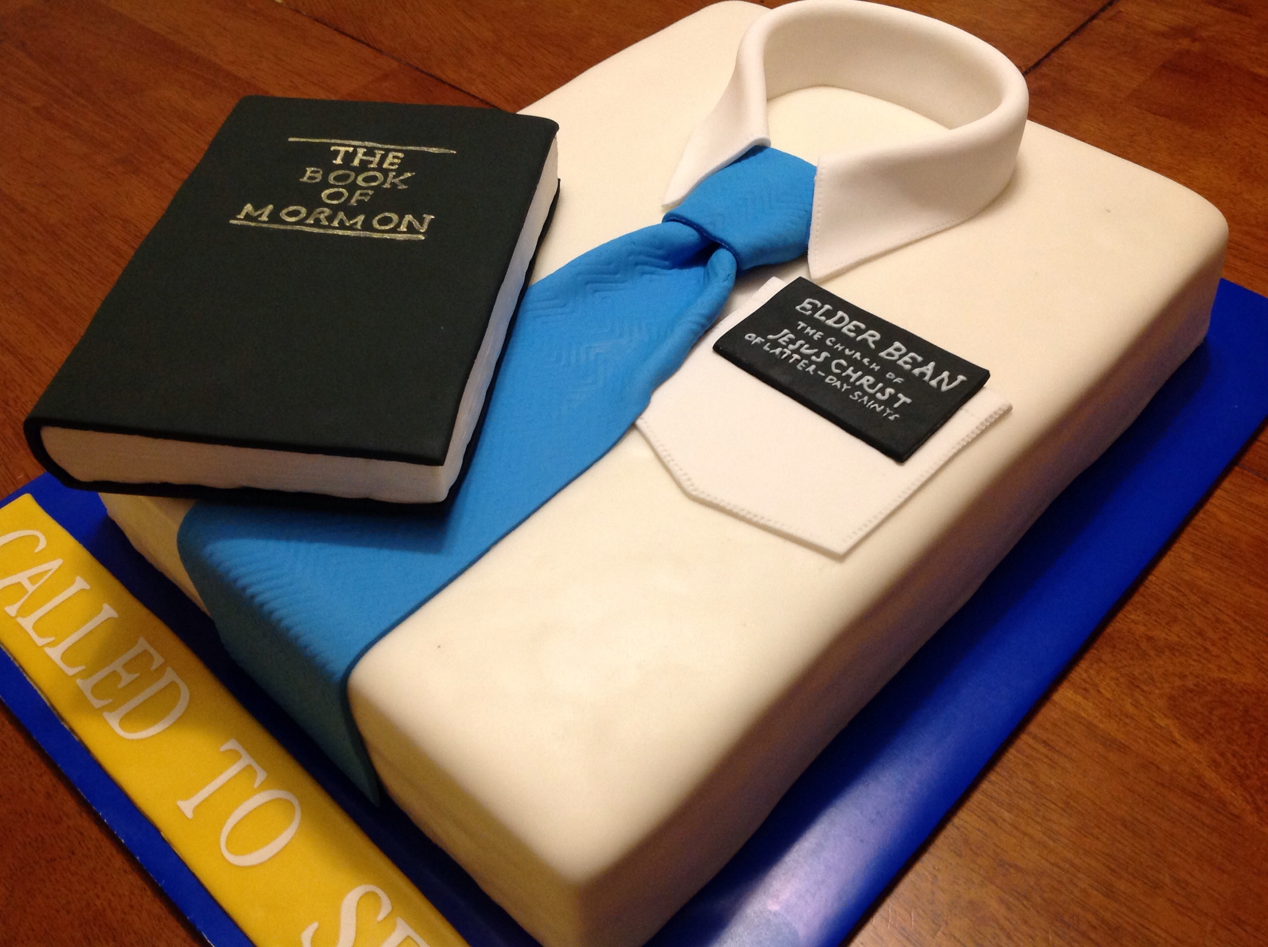 This is the cake I made for a mission farewell open house. Everything on the cake is edible including the missionary tag, The Book of Mormon, and the Called to Serve. It was a chocolate cake filled with cookies and cream filling and covered in chocolate ganache and then fondant.
