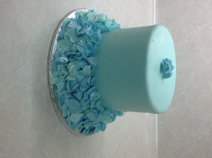 My first attempt. Bottom tier is single layer 8" round. Attached petals then added the 6" cake and attached more petals to hide the bottom edge. I used 5 petal rose cutter and did not double the blossoms. It's OK for a first try. Petals were 1/2 and 1/2 fondant/gumpaste. Next time I would use all gumpaste or a larger ratio. They were more droopy than I would have liked. Thanks for looking.