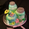 Vanilla Cake, Buttercream icing, Marshmallow Fondant covering. Spray painted in blue and green food coloring to look like Glass Mason jars. Silver sugar painted lids. Fondant flowers.