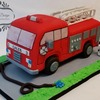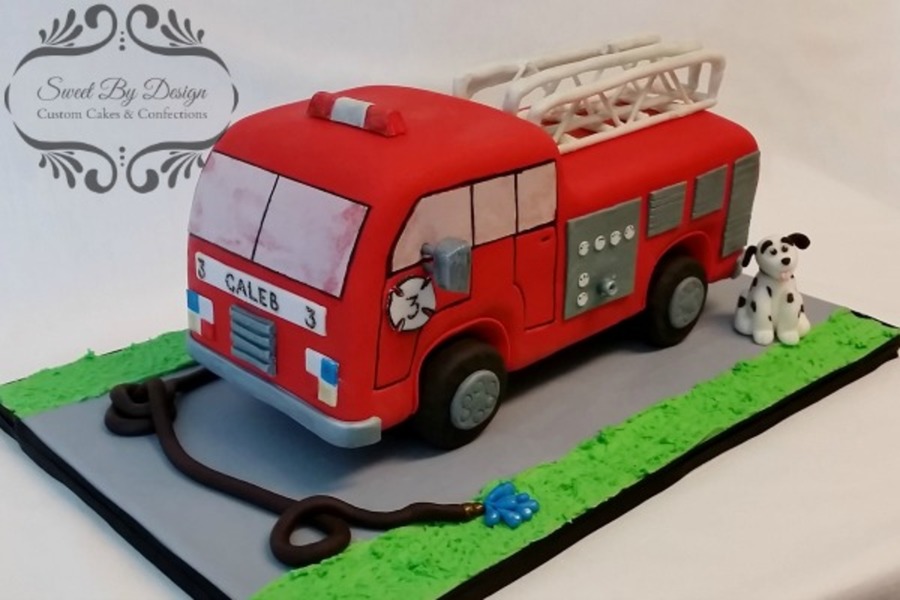 Vanilla caramel cake carved in the shape of a fire truck. Covered in fondant with fondant accents.
