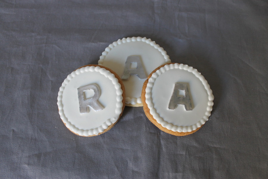Sugar cookies with the initials of the bride and groom for a bachelorette party.