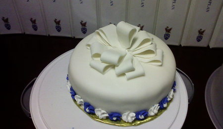 Two tier cake covered in fondant with a cookie topper also cover in fondant.