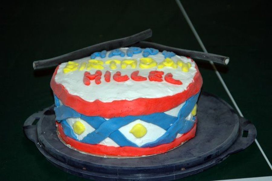 The base is buttercream and the colors are rolled buttercream. The drumsticks are licorice.
