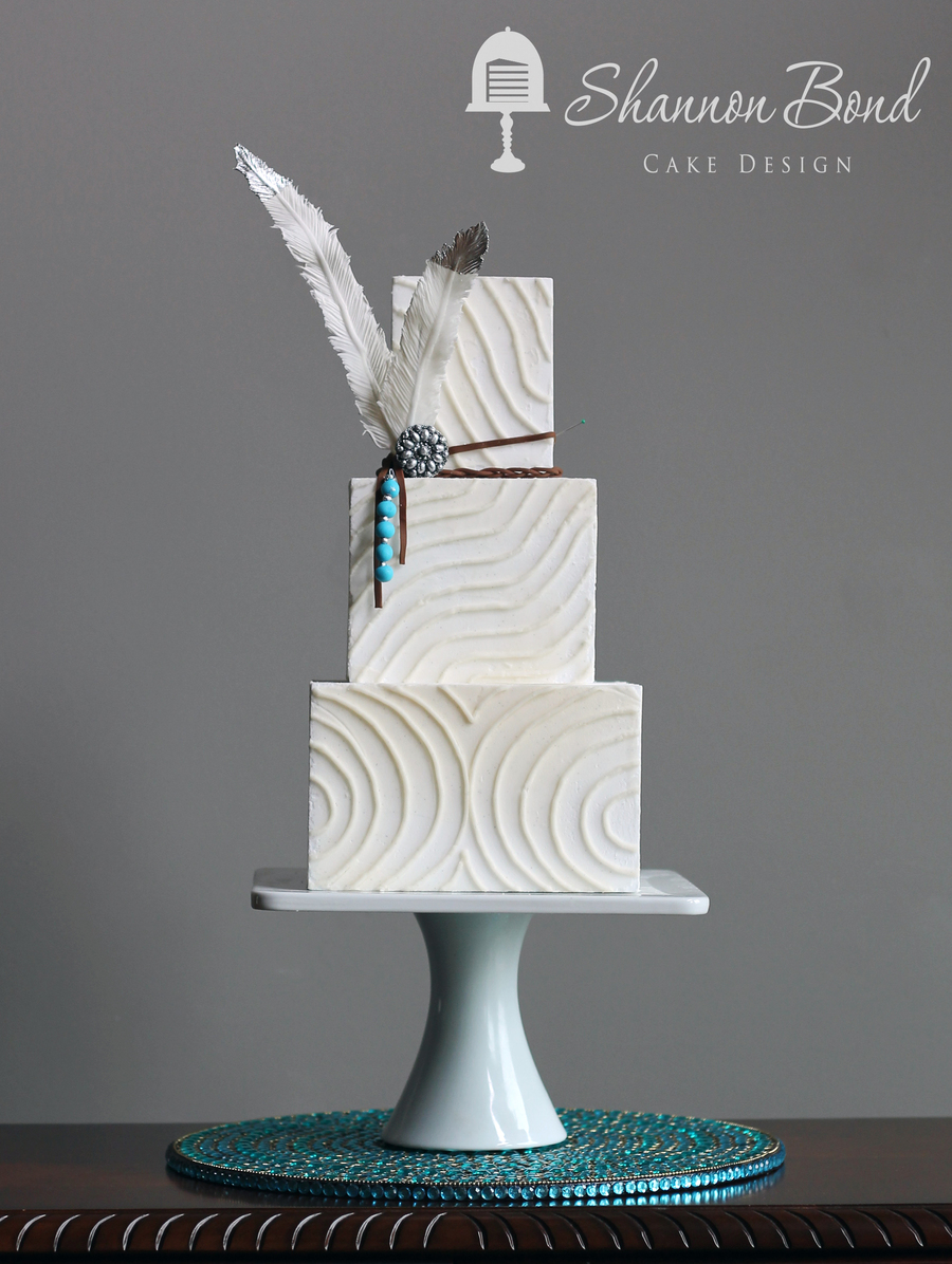 Buttercream piped design on top of a stucco buttercream base. Gumpaste feathers tipped in silver, gumpaste turquoise and silver beads and modeling chocolate leather braids.