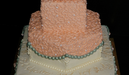 For a backyard wedding. Decorations were made from burlap, lace and wood, so I incorporated textures in the flower petals. The cake stand is made from a clay flowerpot.