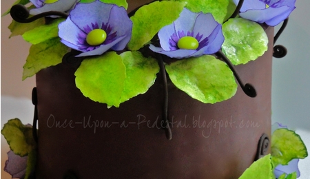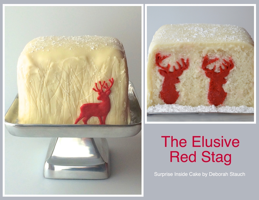 The original plan was to use white chocolate trees but I like the almost shadowy effect of the free hand etched trees much better. I also changed the deer silhouette on the outside to red after making a white one that just didn't go. The first layer of white chocolate ganache exterior was a little thinner than I'd hoped so I added a sturdier coat. Hand piped chocolate deer and a light dusting of powdered sugar snow.