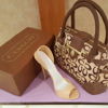 These are Coach logo handbag and Coach shoe box cakes with stiletto heel sugar shoe for my mom's 70th birthday. The box is dark chocolate with chocolate ganache and the purse is vanilla made with lots of gold luster dust.