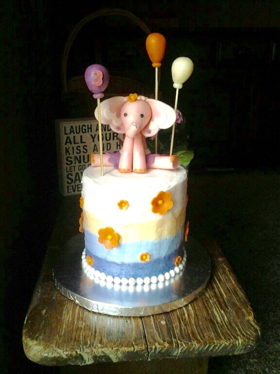 Tall little cake for 3 year old girl. Cake is covered in 4 buttercream colors for an ombré effect. Elephant, balloons, and flowers are candy clay.