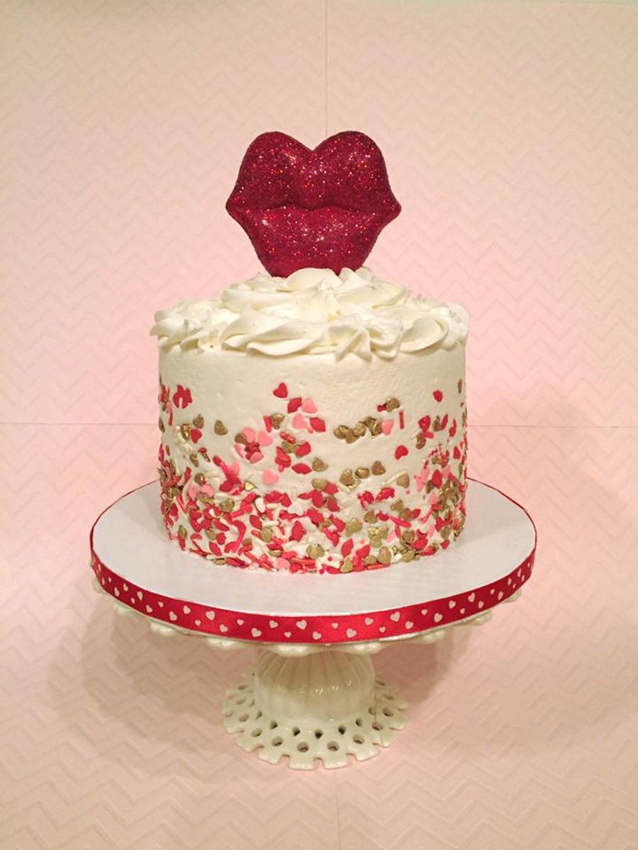 Pina Colada cake covered in buttercream. Assorted sprinkles on the sides and big chocolate lips covered in edible glitter (some say not edible) to make those lips sparkle.