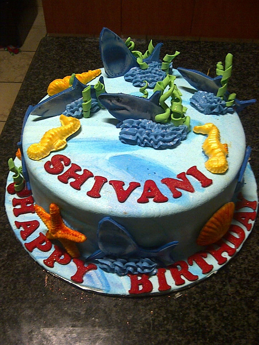 fondant covered choc cake with choc filling. i used rice paper prints of sharks