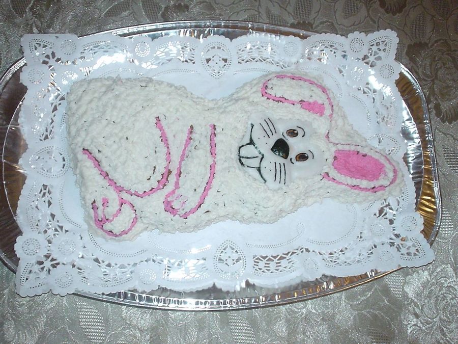 bunny shaped vanilla cake. bunny's face was made of rolled fondant and painted by my son using food decorating pens. rest of the body decorated with BC icing.