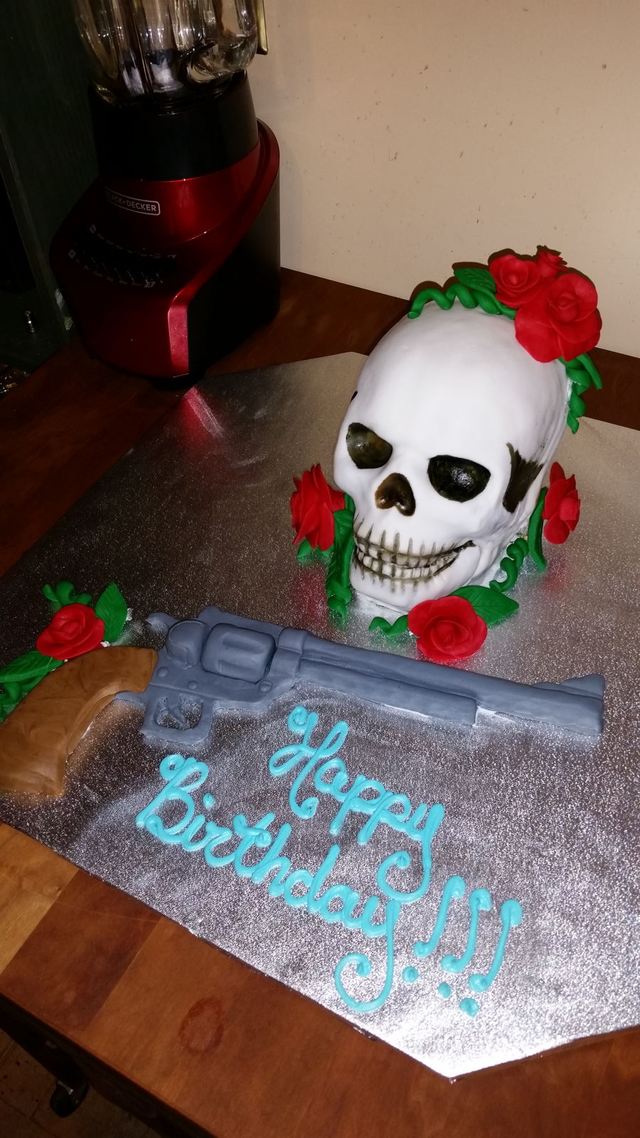 I used a Wilton 3d skull cake pan. I covered the cake with fondant and hand painted the skull with gel food coloring and vodka. Fondant was used to make the 44 magnum. :-) I made by hand.