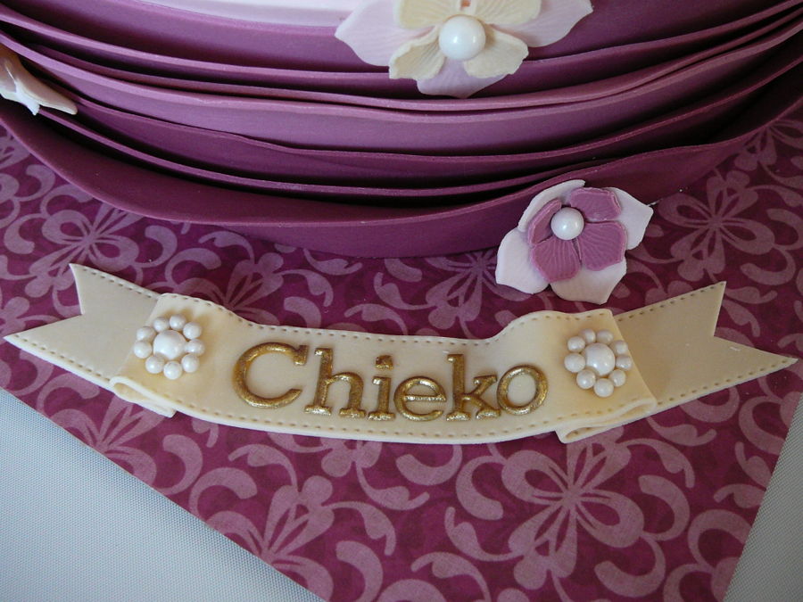 Purple ombre shade frills on the bottom part and flowers on top. Vanille cake with buttercream frosting and fondant. Very feminine cake.