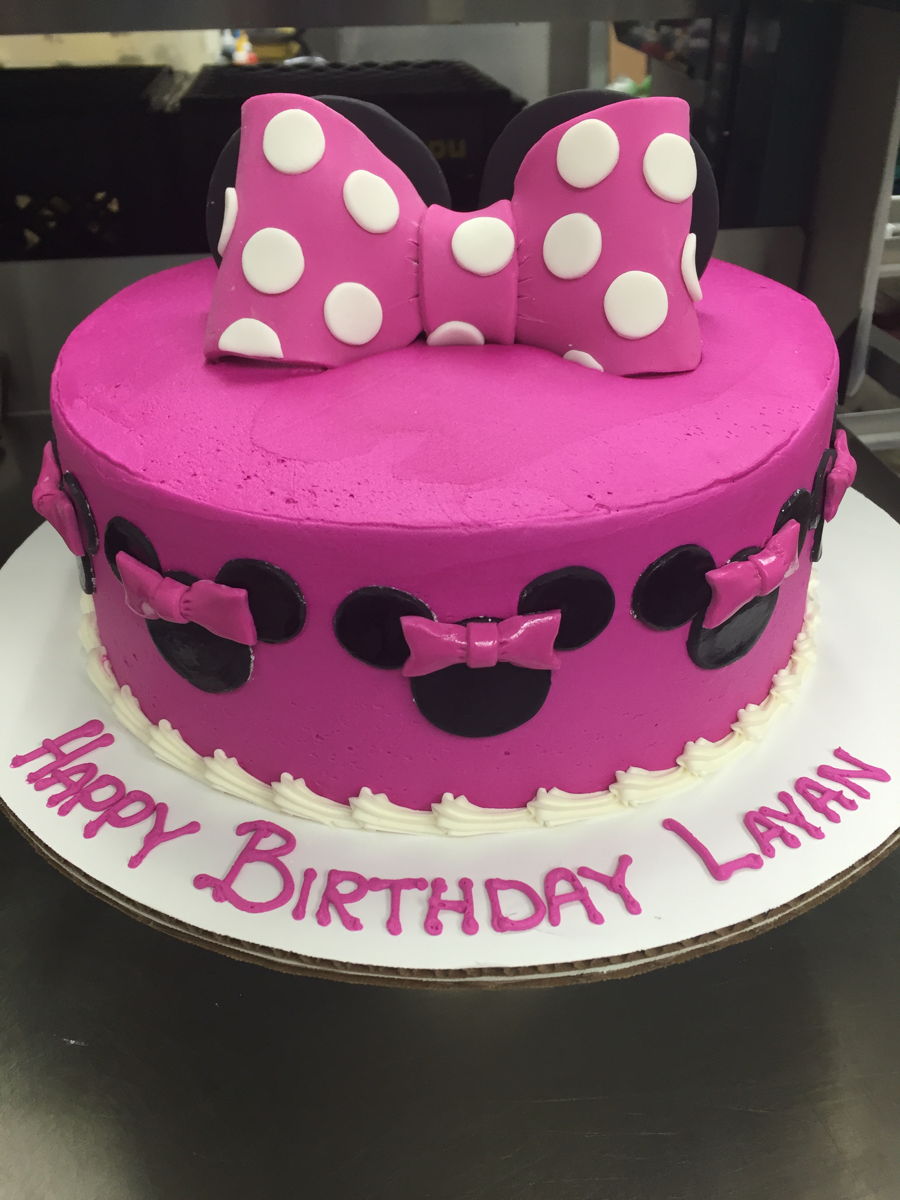 Iced in buttercream with fondant Minnie heads, bow, and ears.