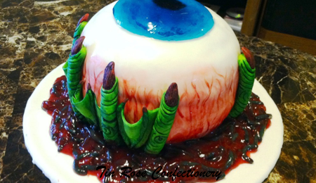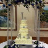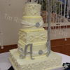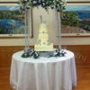 This sophisticated and very elegant wedding cake features five alternating square and round cake tiers that are decorated with fondant scroll work, buttercream accents and fondant wraps. Rhinestone accent pieces were added to the fondant wraps and I made the monogrammed pieces using scrolled wood work and self adhesive rhinestones. I also made the cake arch using PVC piping that was spray painted metallic silver and hot gluing cake gemstone accents to the legs. The beaded curtain that flanks the sides of the cake arch were hand strung using fishing line and plastic beads. On top of the cake arch I placed white wisteria with blue and white roses. To finish off the piece I placed a ring of blue and white roses around each leg. This beautiful cake is offset on top a wooden reinforced stand that was also spray painted metallic silver and covered in the same cake gemstones that I used on the legs of the cake arch. Although the cake arch, cake and sugar flower bouquet made for a beautiful table setting it wouldn't have been complete without the elegant tablecloth that was embroidered by the bride’s grandmother.