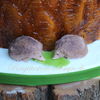 A rustic wedding cake with tree disc and gingko leafes with a dancing couple on top.