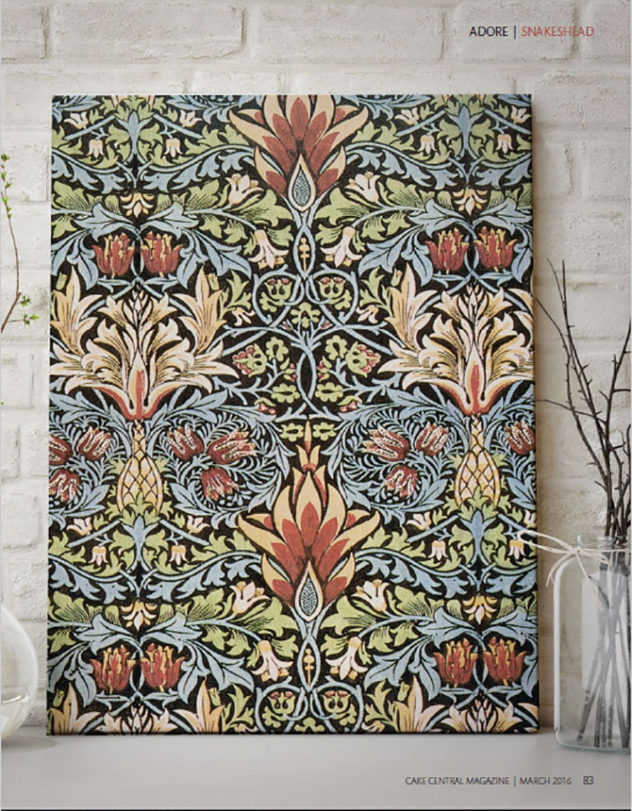 I am so honored to be featured in the Cake Central Magazine, Volume 7, Issue 1 and the cake I designed was inspired by William Morris textile “Snakeshead”
