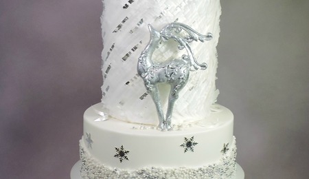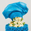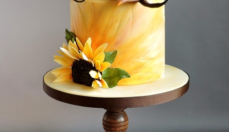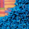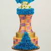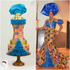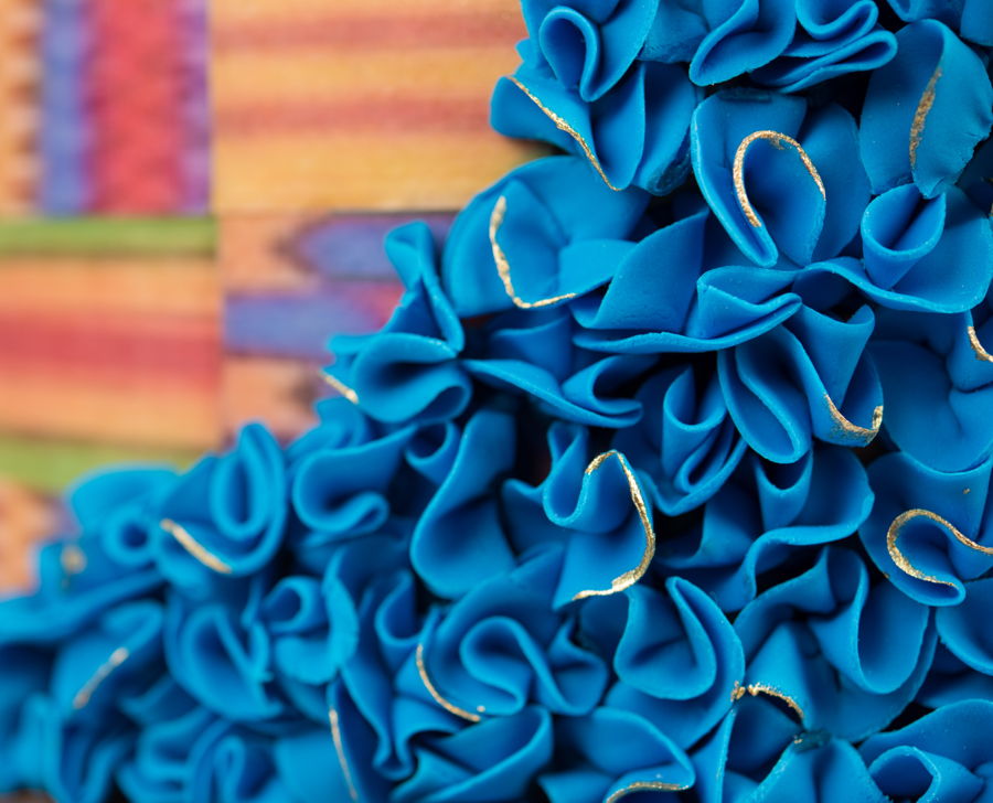 This was my contribution to the Brides Around the World collaboration. My cake inspiration comes from a beautiful wedding dress from Ghana. Ghanaian weddings are time of celebration where the traditional Kente print plays a large role. Each color has a symbolic meaning expressing history, social values and ethics. I used wafer paper to recreate the four patterns and applied each one to the fondant covered tiers. The cake topper head wrap, known as the duku was created using wafer paper treated with Flexique and highlighted with a gold pattern. The tiny blue fondant ruffles are slightly tipped with gold and the cake is finished with little plumeria sugar flowers.