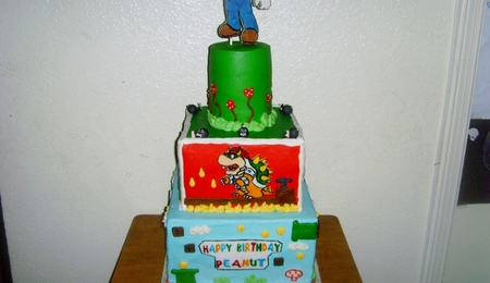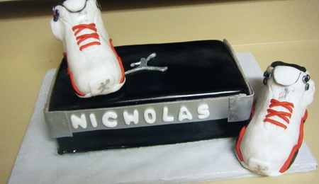 8" round. Frosted in buttercream. Trimmed in fondant. I made the cake for my husbands birthday.