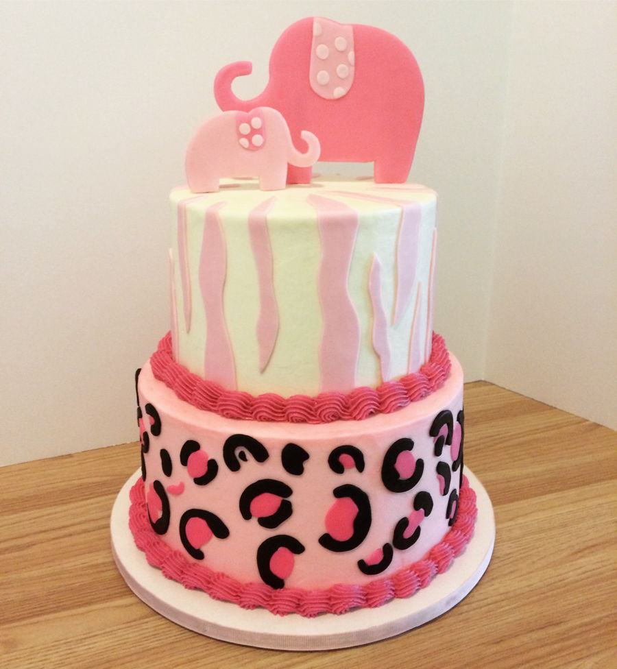 Pink Safari baby shower cake. Vanilla cake with buttercream icing and fondant decorations.